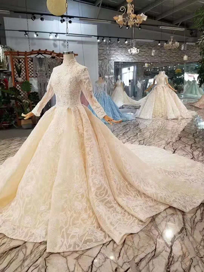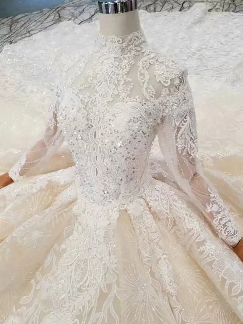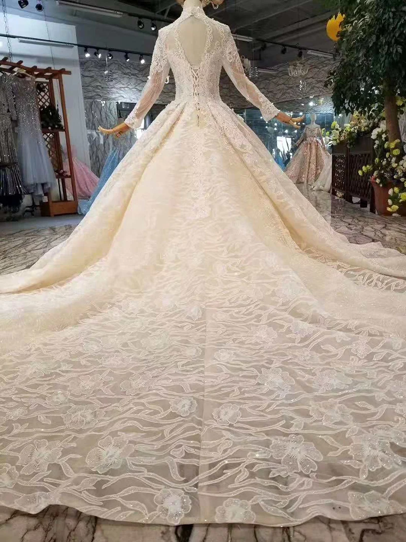 Special Offer LS11246 فستان زفاف فاخر من الدانتيل برقبة عالية وأكمام طويلة بأربطة من الخلف مزين بأردية طويلة من Célébrité Discount 50% Today!