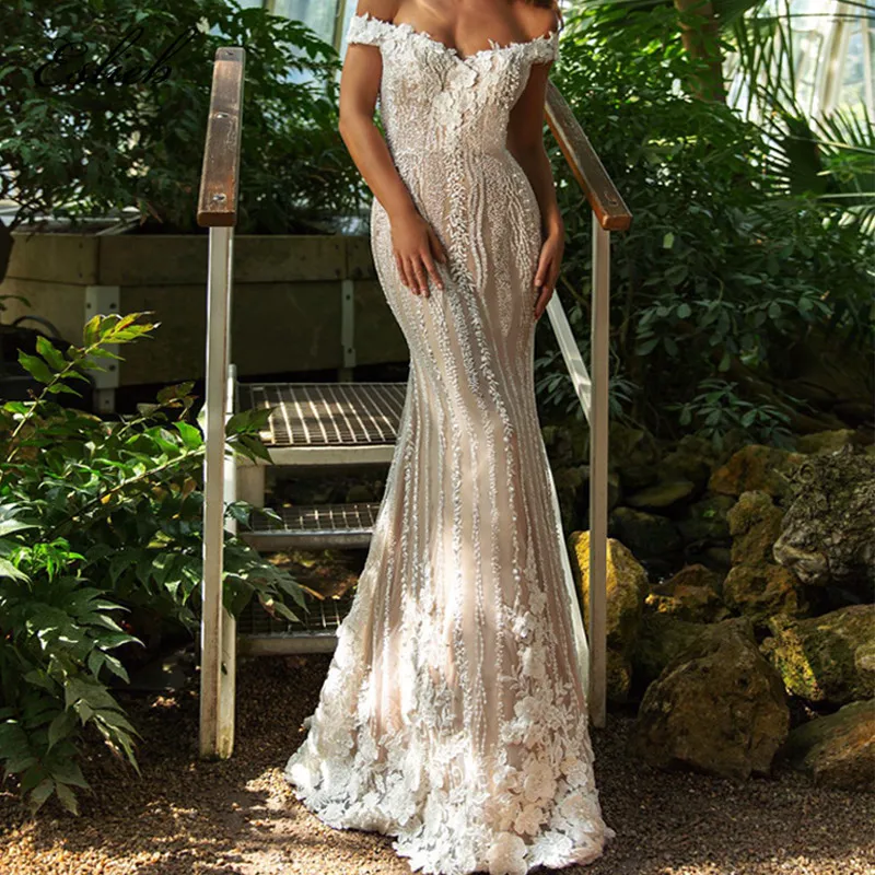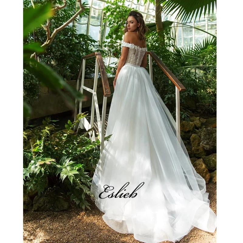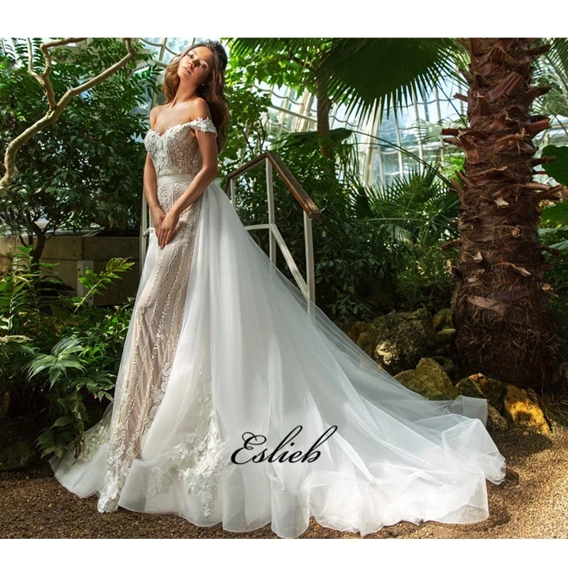 Special Offer الفاخرة الرباط يزين فساتين الزفاف 3d الزهور فستان زفاف قبالة الكتف الزفاف اللباس انفصال تول الذيل HA034 Discount 0% Today!