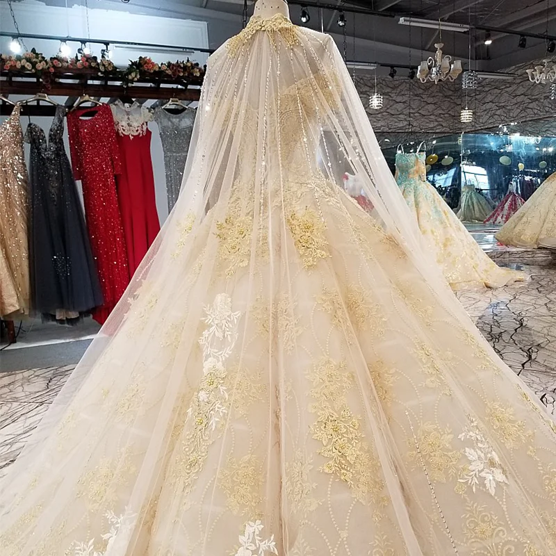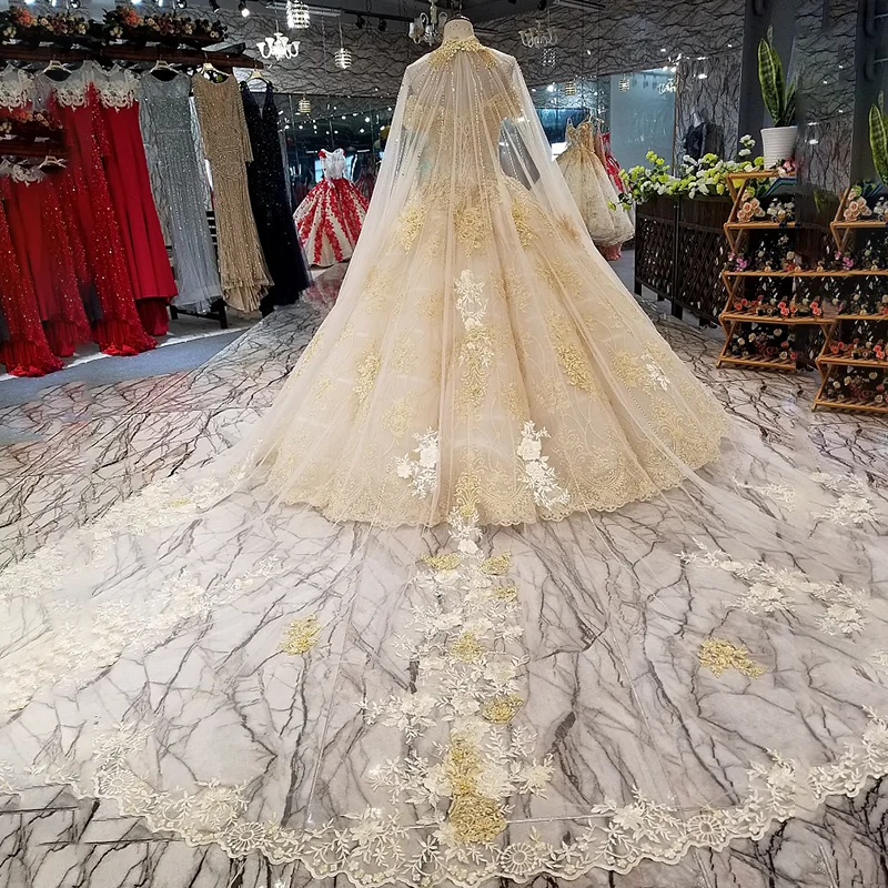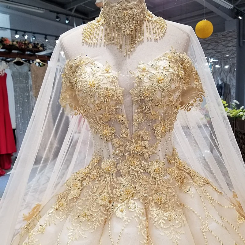 Special Offer LS17655 الفاخرة الدانتيل الذهبي الديكور دبي فستان الزفاف الحبيب قبالة الكتف فستان الزفاف مع قلادة ذهبية طويلة الرأس Discount 50% Today!