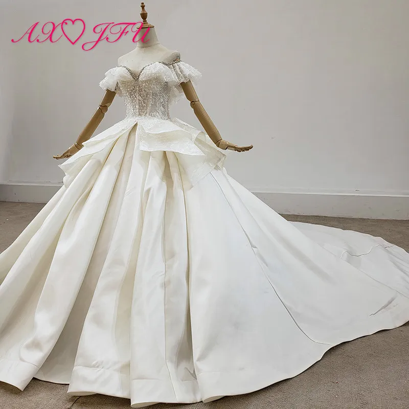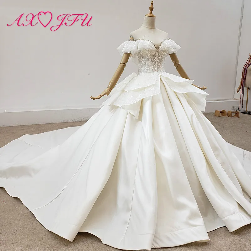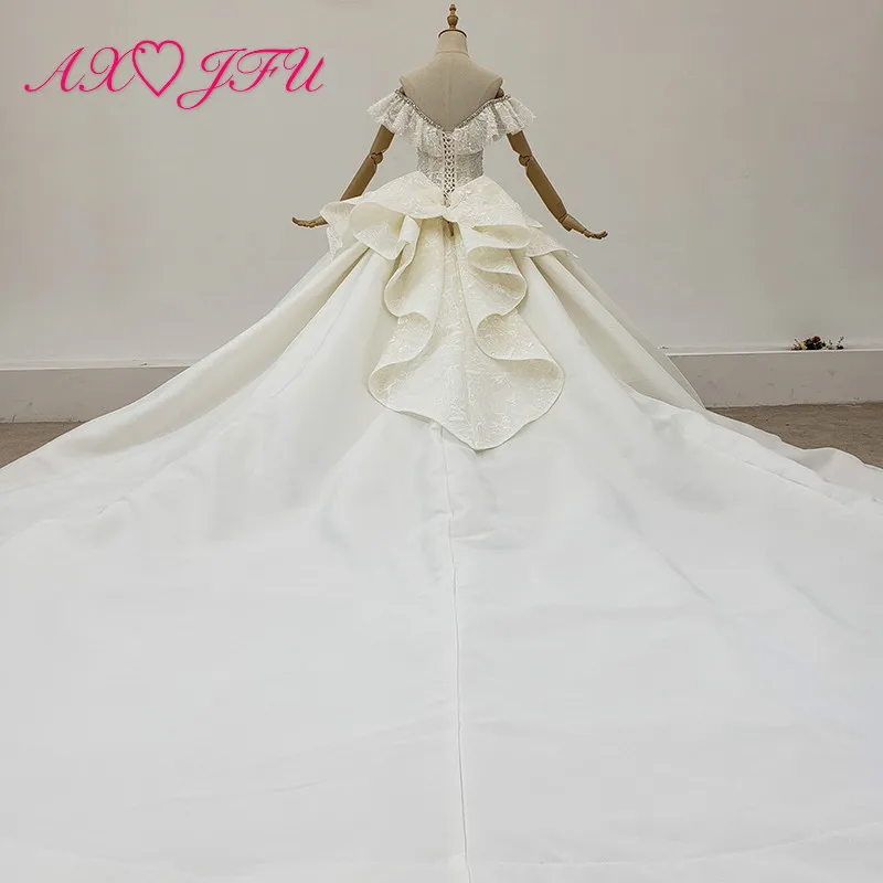 Special Offer AXJFU الفاخرة الأميرة الخرز كريستال الوهم الكرة ثوب اليدوية قارب الرقبة زهرة بيضاء فستان الزفاف الدانتيل 100% صور حقيقية Discount 50% Today!