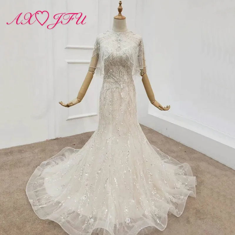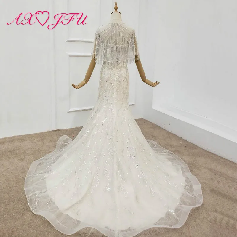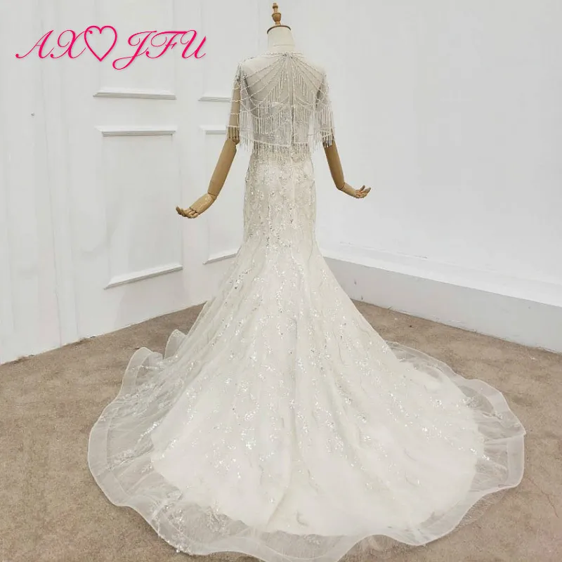 Special Offer AXJFU الفاخرة الأميرة الخرز اللؤلؤ الكريستال البوق الدانتيل الأبيض اليدوية س الرقبة العروس الشمبانيا حورية البحر فستان الزفاف 99551 Discount 50% Today!