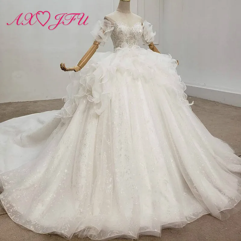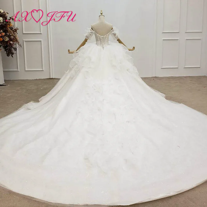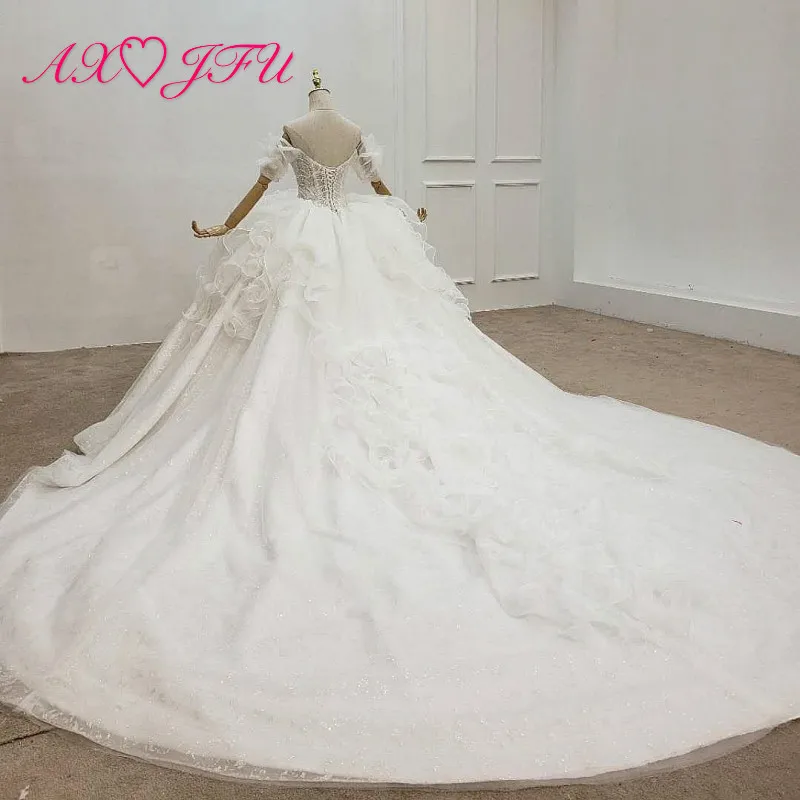 Special Offer AXJFU الفاخرة الأميرة الخرز الكريستال الوهم الدانتيل الأبيض اليدوية قارب الرقبة العروس حفلة قطار طويل الكشكشة فستان الزفاف 99587 Discount 50% Today!