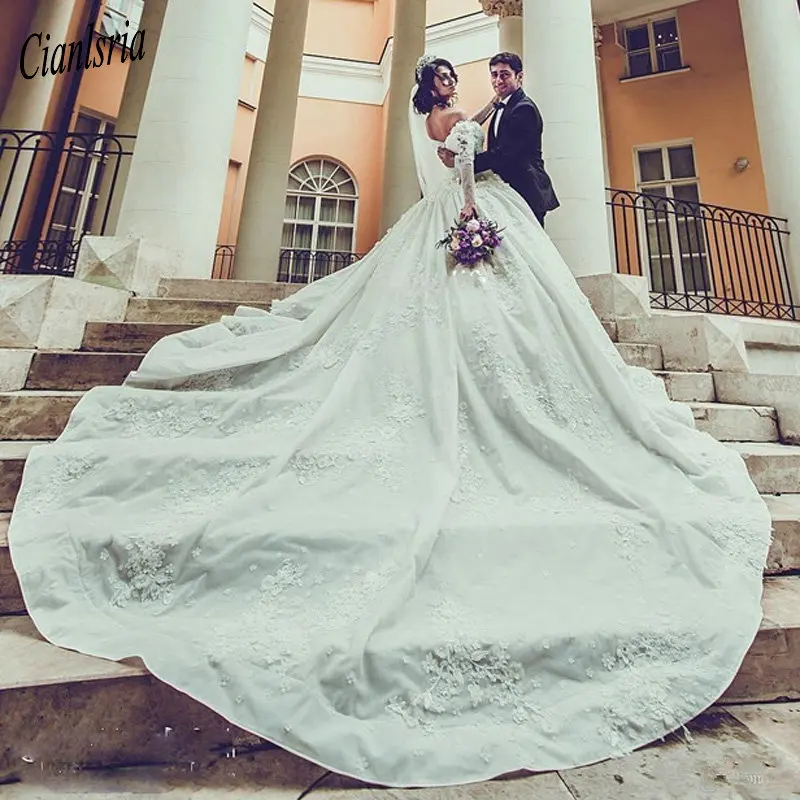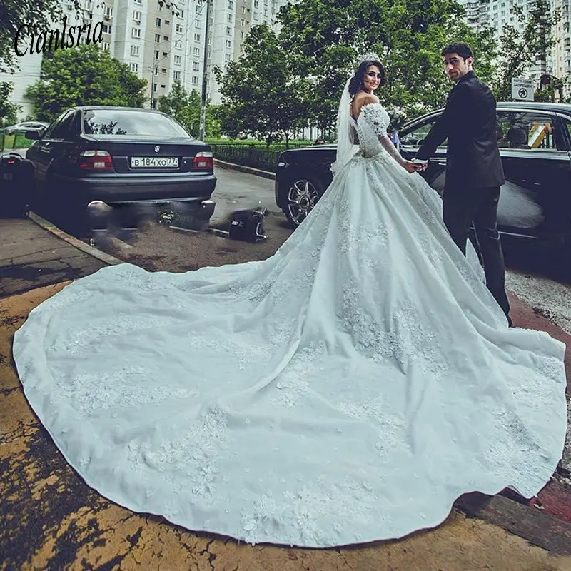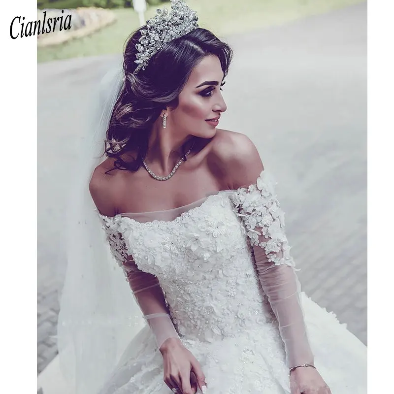 Special Offer مثير الفاخرة طويلة الأكمام الزفاف فساتين قبالة الكتف Ullusion اللؤلؤ الدانتيل يزين أثواب الزفاف كاتدرائية قطار فستان الزفاف Discount 25% Today!