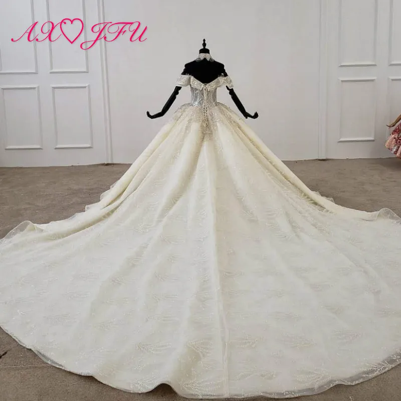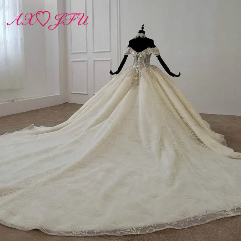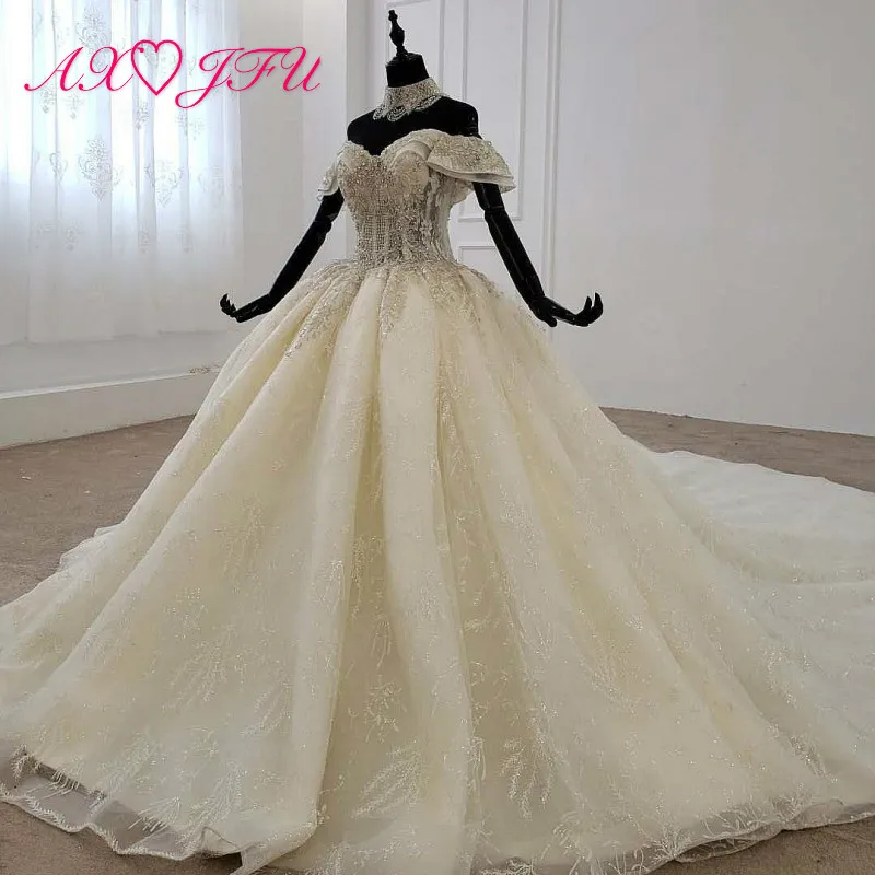 Special Offer AXJFU الفاخرة الأميرة الخرز الكريستال الوهم الأبيض الكشكشة الدانتيل اليدوية قارب الرقبة العروس الشمبانيا سباركلي فستان الزفاف 99508 Discount 50% Today!