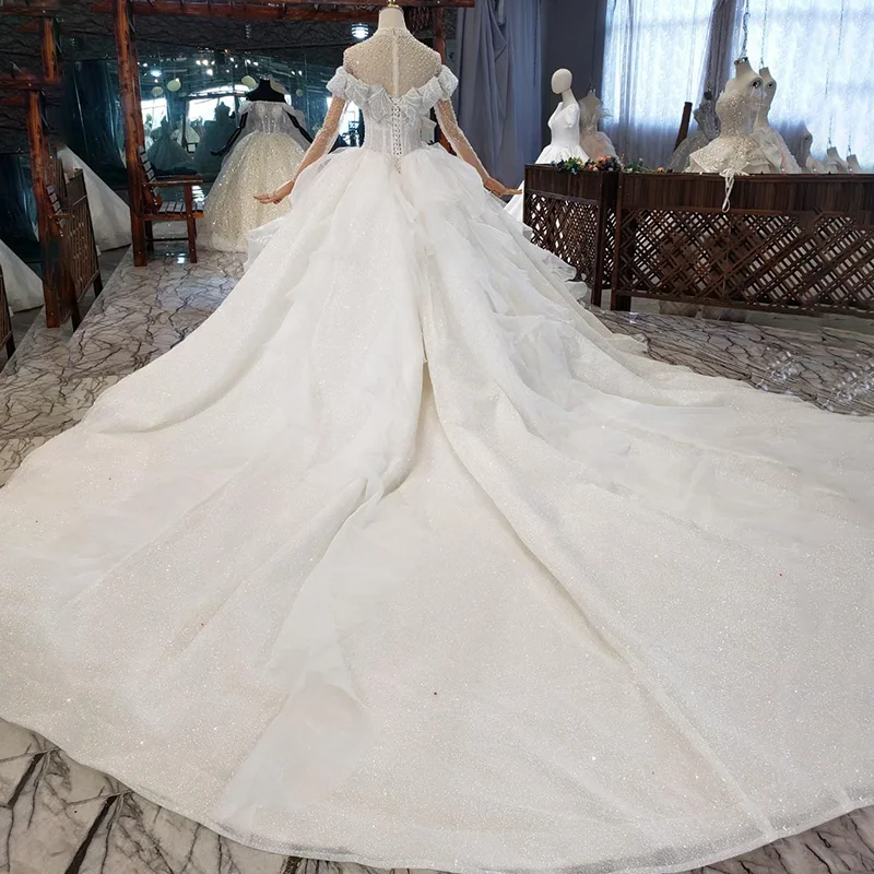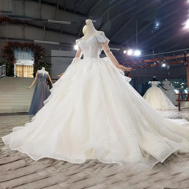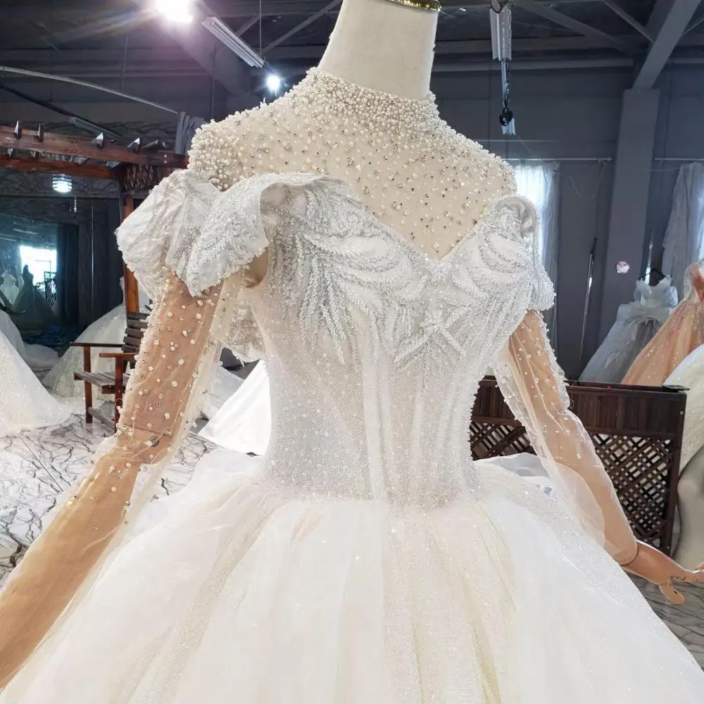 Special Offer فستان زفاف مزين بالخرز باللون الأبيض البسيط من HTL1846 فستان زفاف برقبة عالية وأكمام طويلة من على الكتف موديل 2020 Discount 55% Today!