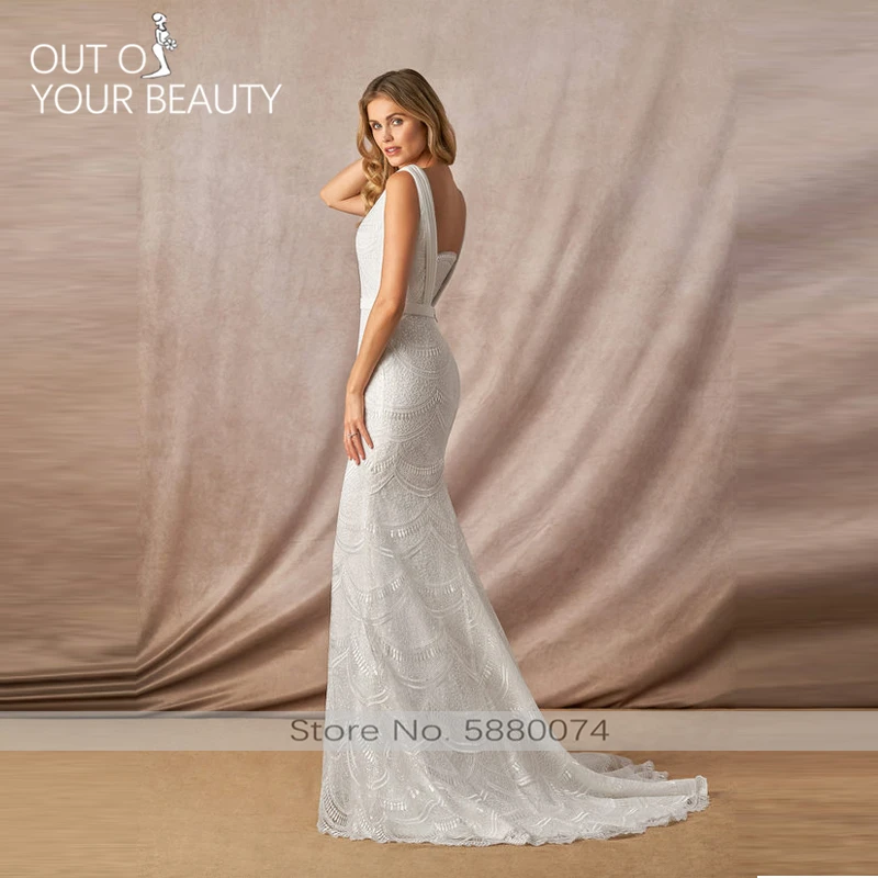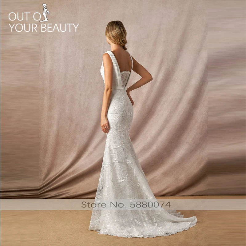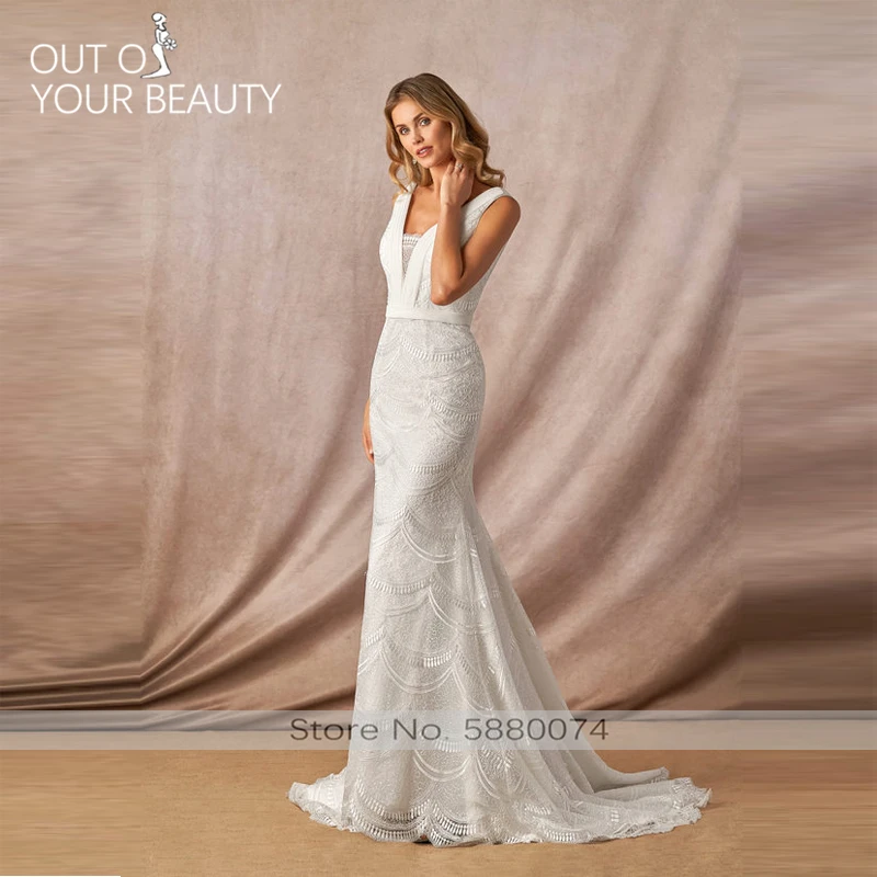 Special Offer فستان زفاف فاخر أبيض ميرمان 2020 جديد دانتيل رقبة على شكل حرف V مخصص ظهر بدون ظهر مزين مطرز ذيل 50 سنتيمتر Discount 0% Today!
