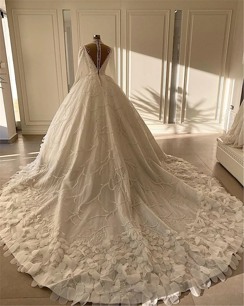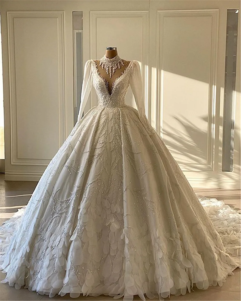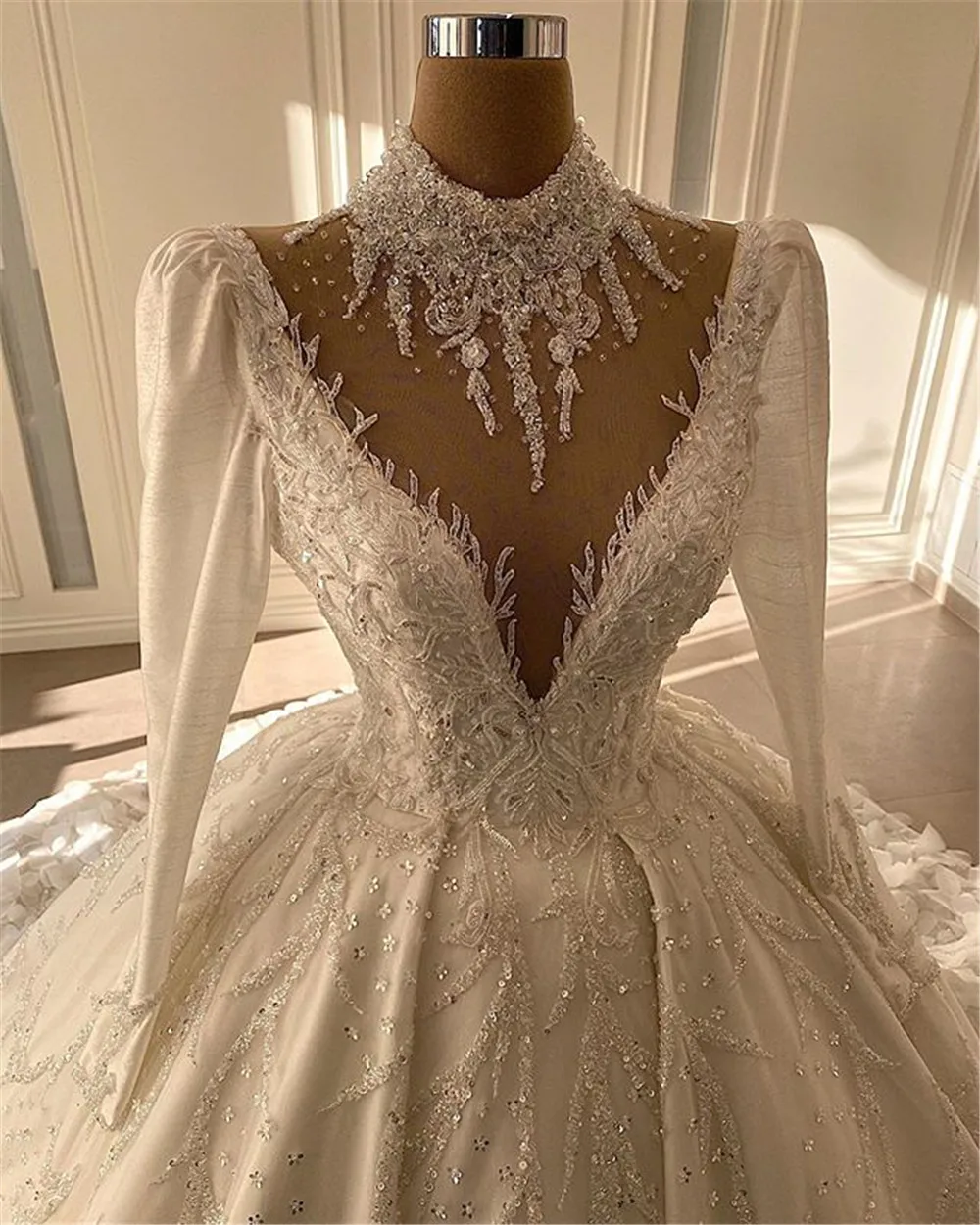 Special Offer رائعة الدانتيل الخرز الكرة ثوب الزفاف مع قطار كاتدرائية فاخرة الأحجار عالية الرقبة طويلة الأكمام الزفاف زي العرائس Discount 50% Today!
