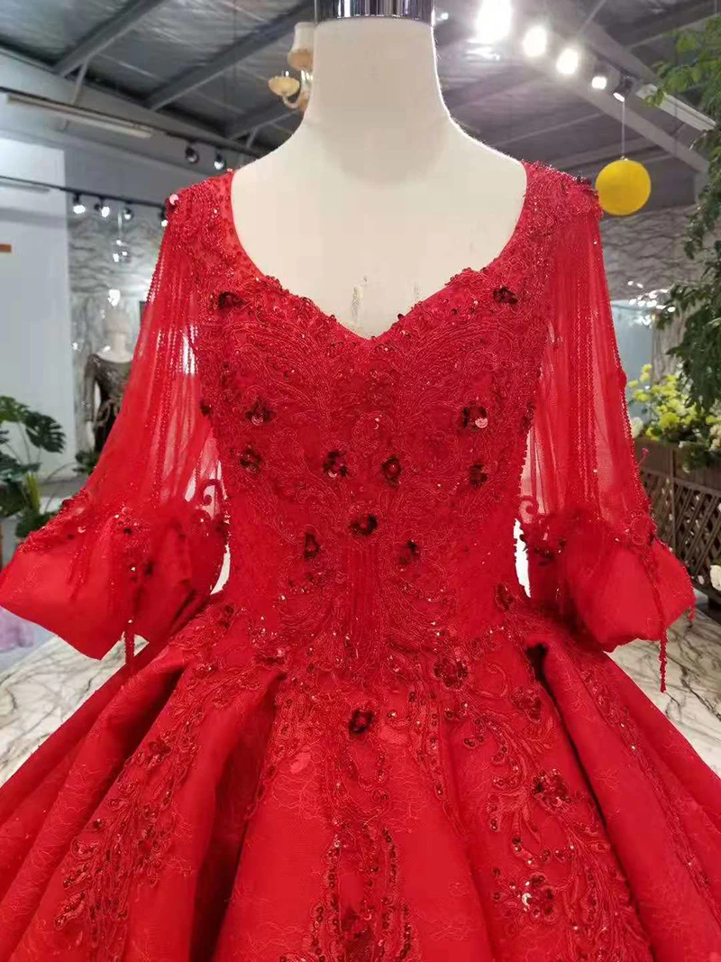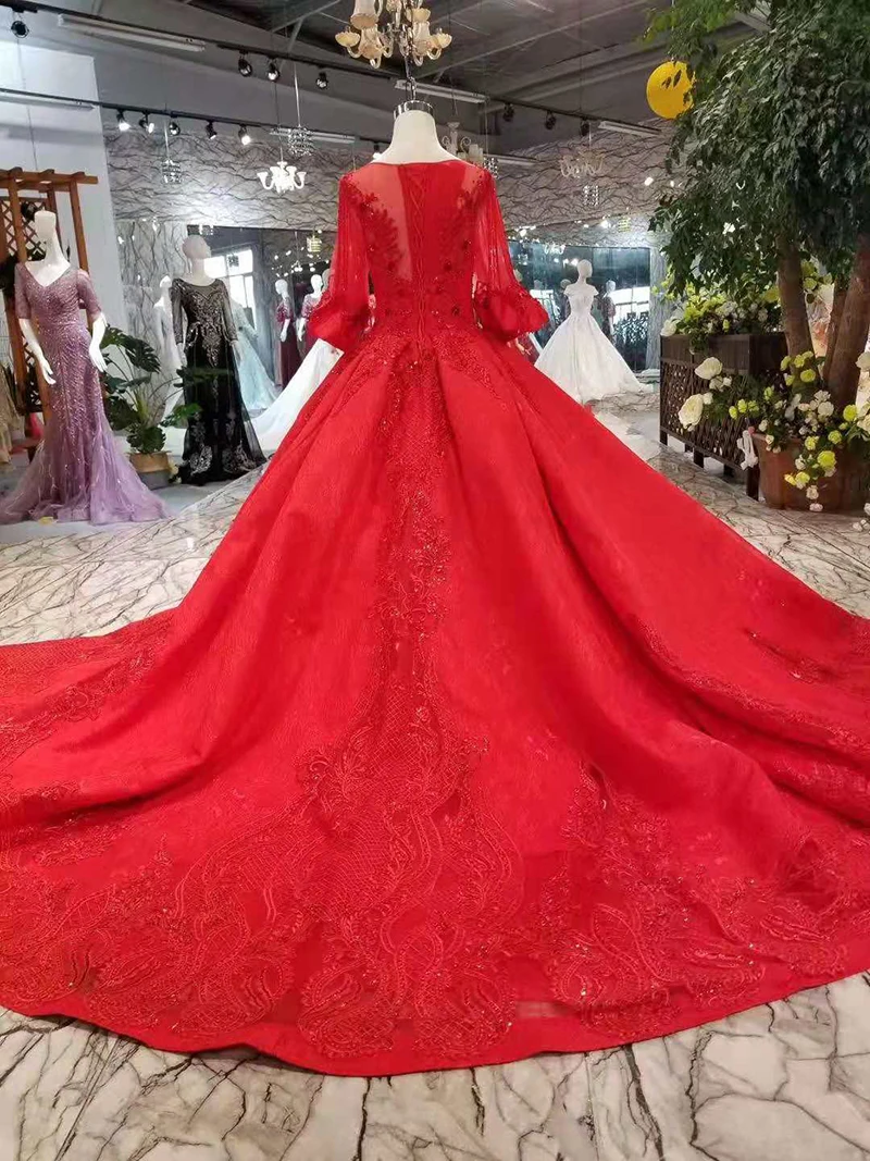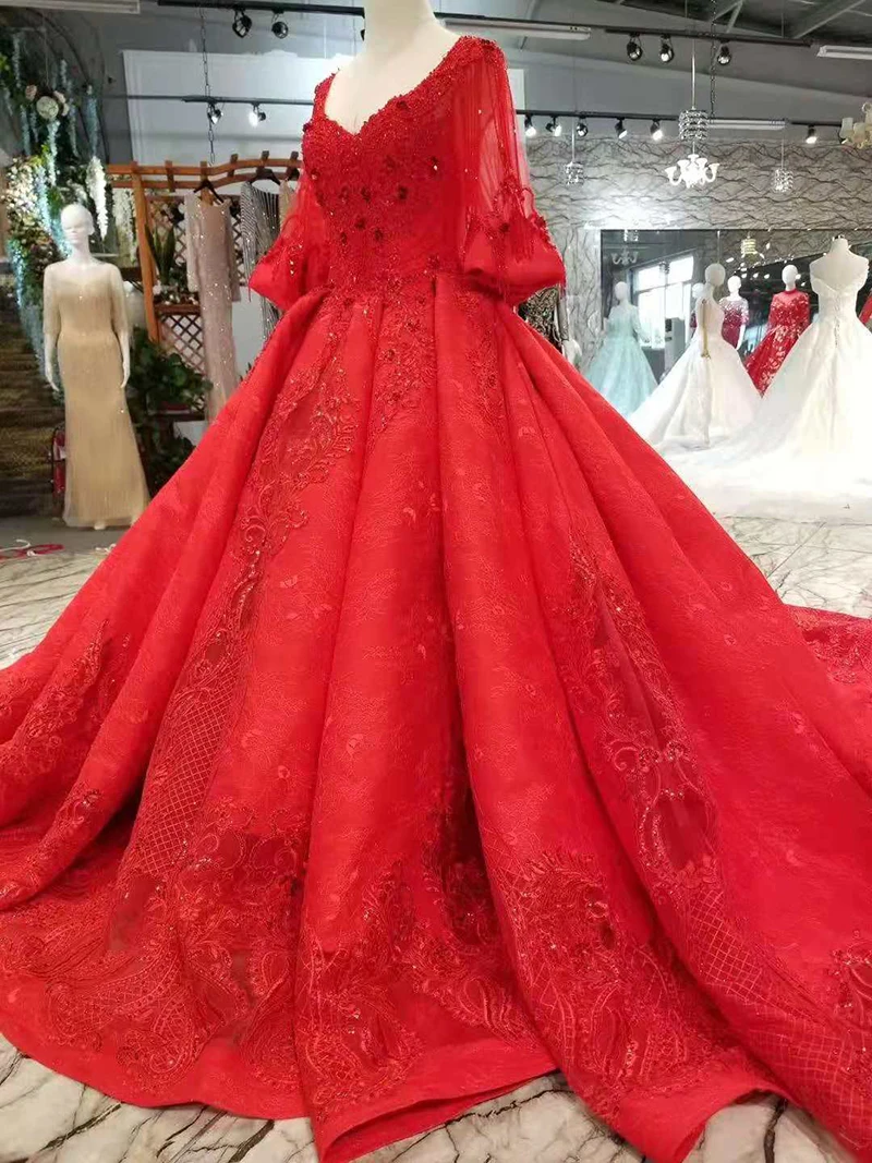 Special Offer LSS285 فساتين زفاف حمراء كبيرة الخامس الرقبة منتفخ نصف الأكمام فساتين الزفاف مع قطار طويل الكرة ثوب العروس فستان حفلات الزفاف 2020 Discount 50% Today!