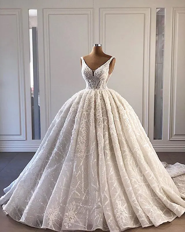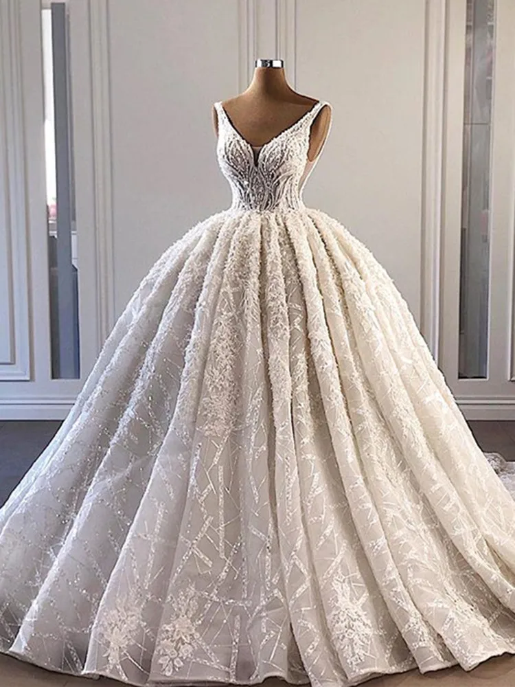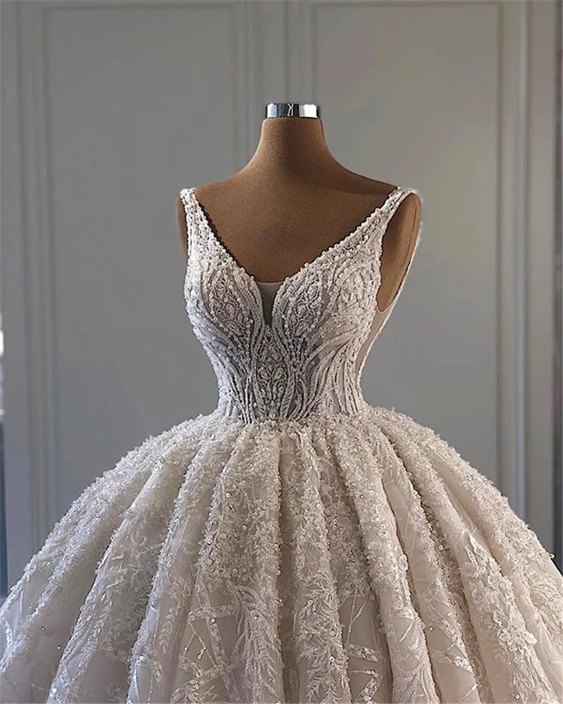 Special Offer فاخر الدانتيل الخرز الكرة ثوب الزفاف 2021 Vestido De Noiva رومانسية الخامس الرقبة تانك كم الزفاف زي العرائس رداء دي Mariage Discount 50% Today!