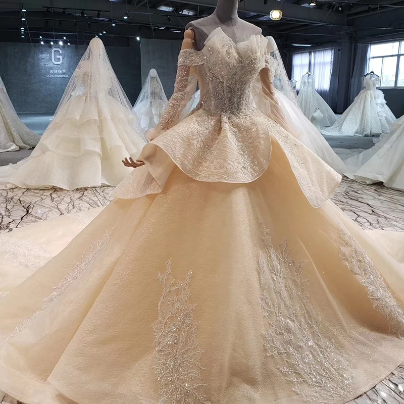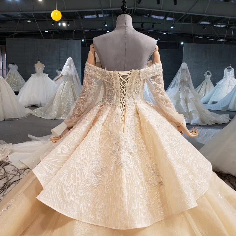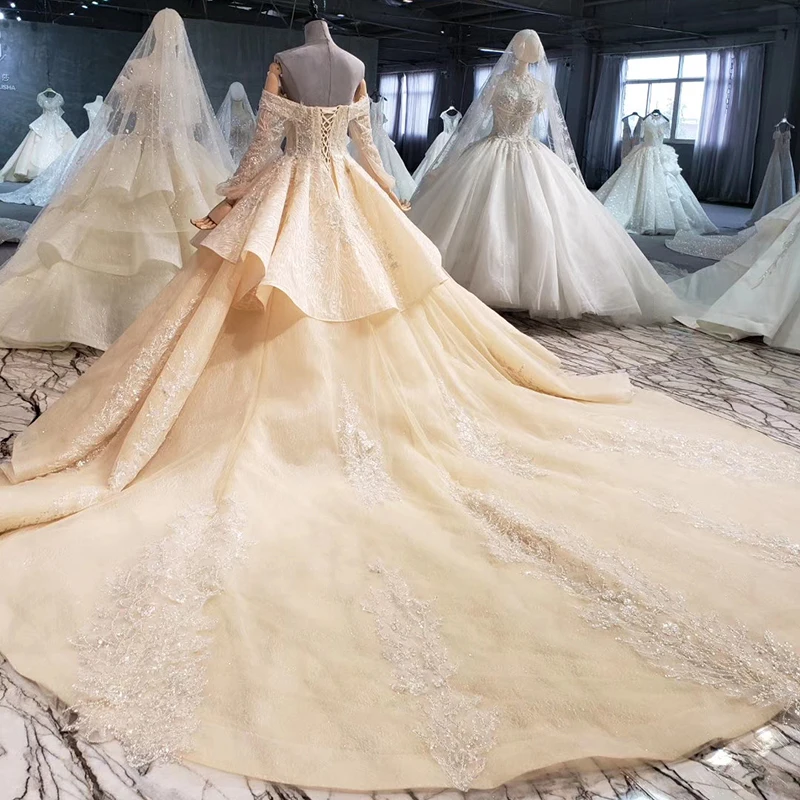 Special Offer فساتين زفاف الأميرة BGW 22425ht مع ذيل خارج الكتف طويلة الأكمام الدانتيل فساتين الزفاف الشمبانيا القرون الوسطى رداء دي ماري Discount 56% Today!